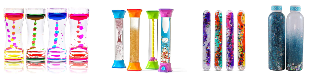 Glitter bottles/wands are a no-brainer! Even without autism, these are so calming! You can easily make your own, but it can be a mess. Here are some that you can buy: Liquid Motion Bubbler, Sensory Fidget Tubes, Spiral Glitter Wands, Calming Bottle.